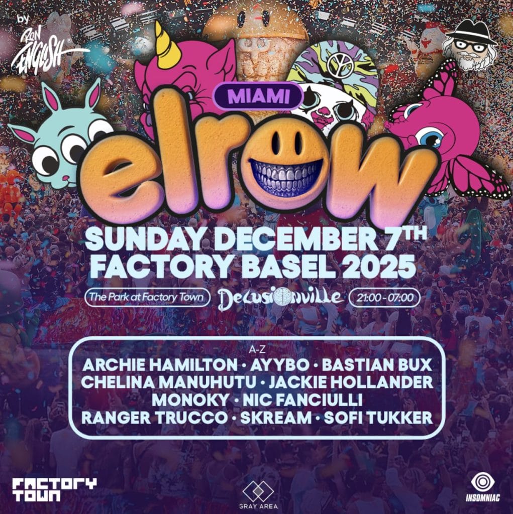 Elrow returns to Factory Town with Delusionville, its most theatrical Art Basel creation yet. Inspired by Ron English’s surrealist universe, the party transforms the venue into a dreamlike maze of pop-art creatures, kaleidoscopic stages, and immersive characters drifting through the crowd. This year’s soundtrack is powered by AYYBO, Archie Hamilton, Nic Fanciulli, Ranger Trucco, Skream, and more, bringing a wide spectrum of house, tech, and underground energy from sunset deep into Monday morning. Known for its all-night spectacle and over-the-top production, Elrow’s Basel takeover remains one of the city’s most unforgettable finales.