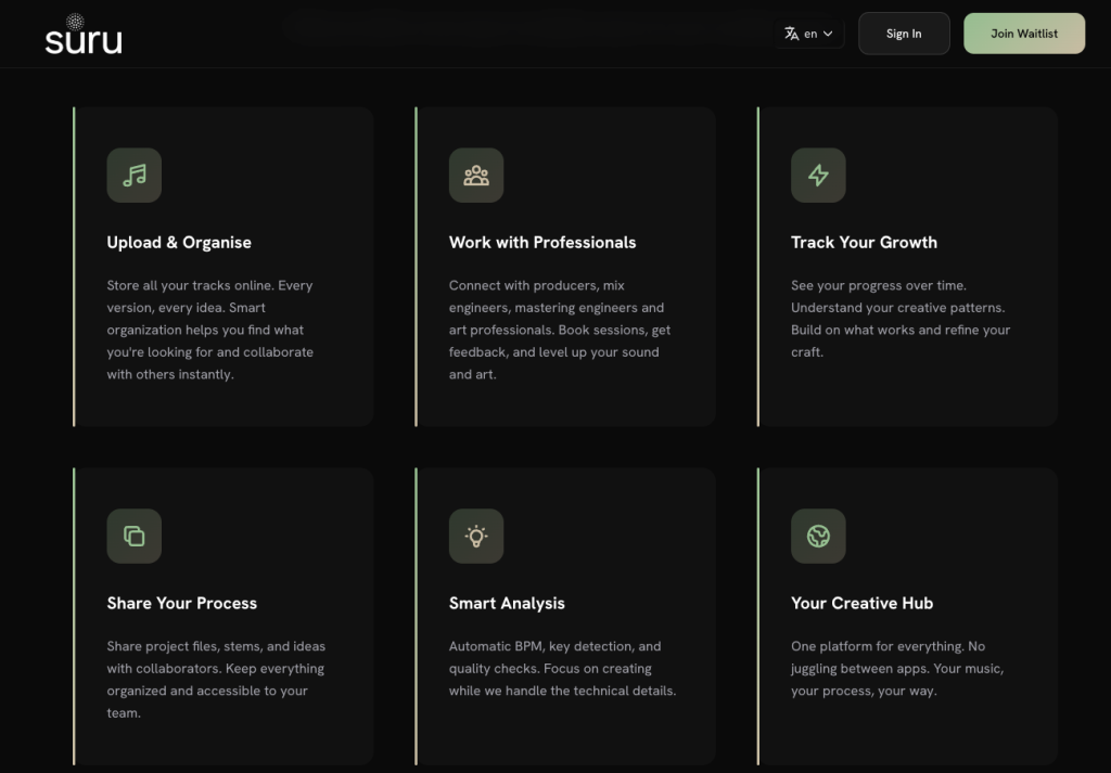 Knowledge matters, and knowledge paired with real application changes outcomes for artists. Many artists use multiple online platforms for sharing audio and collaborating, and Suru is meant to reduce that fragmentation by putting core needs in one place, so creators can keep focus on finishing work and improving decision-making.