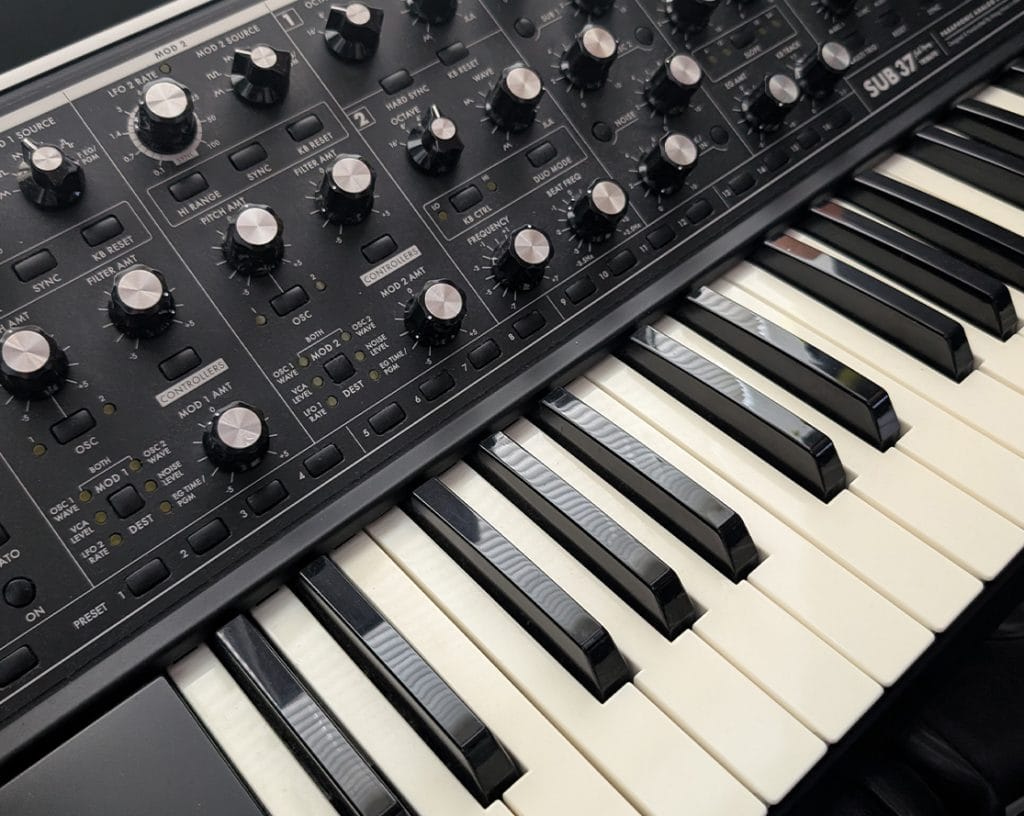 For the bassline, we used the Moog Sub 37. In duo phonic mode, it was perfect for doing the groovy stab chord sounds. That was also layered with a more mono subby saw tooth underneath.