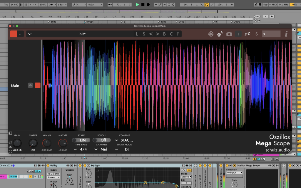 I’m mostly using Oszillos Mega Scope to make sure things are loud enough, specifically the kick, the snare, the sub and also the track as a whole. Sometimes it might sound like the kick or snare is hitting where it should be when actually you need to boost it a few db.