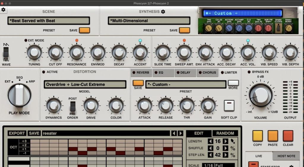 Phoscyon 2 sounds really good and is such good fun and easy to use. One of the benefits is definitely the sequencer, which is really simple and easy to program. But it also offers a lot in terms of control. It includes some of the well-known 303 parameters, and I particularly love the option to control the accent decay and accent volume. For re-eater I set both values really high as this is then really effective in tweaking the accent. One of my favourite things about Phoscyon 2 is the calibration parameters where you can change the set-up of the synth and fine-tune its overall sound.