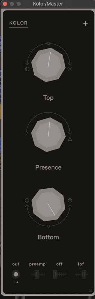 For this track, the key use of Kolor was on the master channel. It finishes the mix nicely and beefs up the low end. It’s easy to use and sounds fantastic.