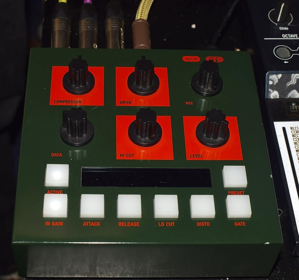 This box is really important to the sound I was going for. Boum is an analogue distortion and compression unit. I used it as a kind of pre-mastering tool. I route the entire mix out of my MOTU 828x into the Boum, then into my Mackie 1202 mixing desk, and then record the output back into Ableton.