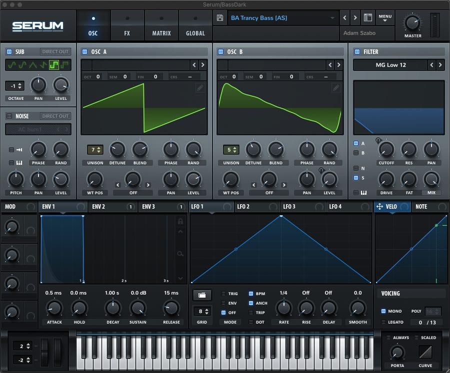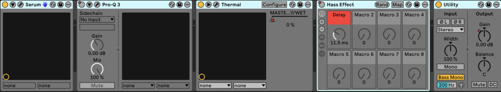 The bass sound starts with Serum from Xfer Records using “BA Trancy Bass” factory preset. I automate Pro Q from FabFilter EQ Bell Curve on for a dark sound in the verses and off for a bright sound in the choruses. I automate Thermal from Output to add power and grit to the bass in the choruses and widen the sound with a custom Hass Effect. Thermal is a great distortion plugin that I use on bass, guitar, vocals, and drums. If I am not using Decapitator from Soundtoys, I am using Thermal. And at the end, I automate some volume differences between dark and bright effects applied to the track.