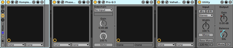 Like the bass and the horns, the LiveRotos (recorded live) and DrumRotos (pre-recorded) tracks have identical processing chains. I have loved the sound and expressiveness of roto toms for the moment I heard them. And when I discovered them inside Damage for Native Instruments, which was a bit of surprise since the plugin is aimed at cinematic percussions, I plugged them right into the a new Live Expression that ultimately became Twitch.