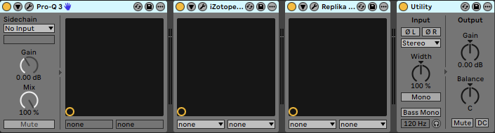 The live yeah vocals starts with Pro Q3 EQ low-cut filter to remove the low end, a few cuts to remove boxiness of my voice, and high self to add a little brightness. I follow the EQ with Nectar 2 from Izotope and a custom preset, which may be a surprise, but I find myself still going back to vocal effects in Nectar 2, 3, and 4. I wanted to add a very long, almost hypnotic delay to the yeah vocals, and used Replica XT from Native Instruments, one my favorite delay plugins when I am not using EchoBoy from SoundToys. And lastly, I am not using Utility for this track, but it’s standard procedure for me to add it at the end of every track.