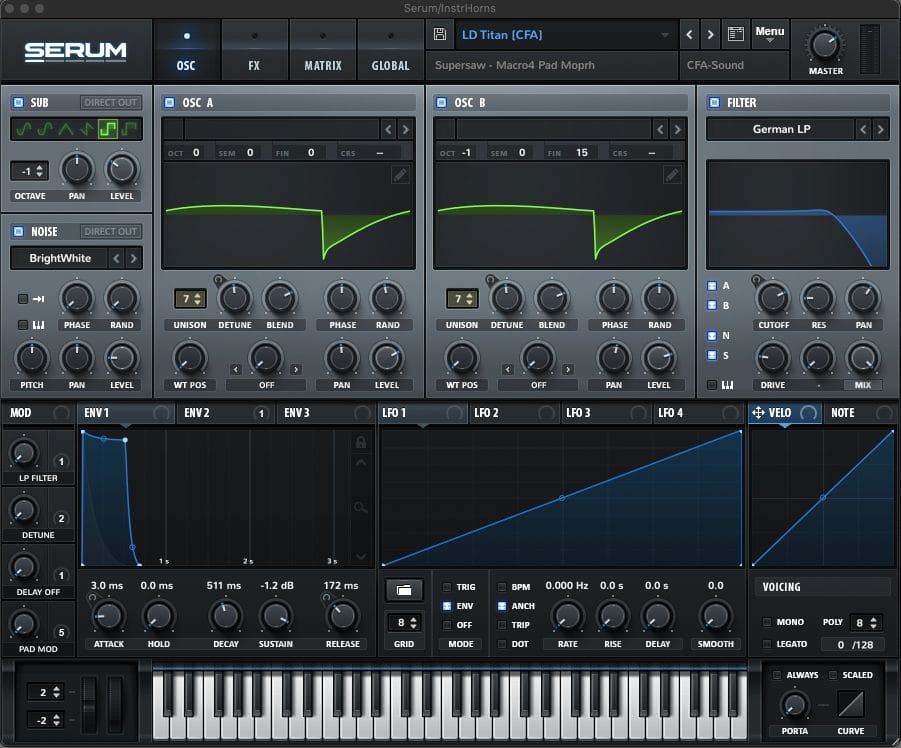 LiveHorns (recorded live) and InstrHorns (pre-recorded) tracks have identical processing chains, like the bass. The horns’ sound is almost exclusively Serum from Xfer Records using “LD Titan” factory preset, with just a light Pro Q from FabFilter low-cut filter to remove the low end along with Wider from Polyverse to expand the sound in the stereo field. And at the end, I automate some volume changes in sections of the song where the horns are little too bright.