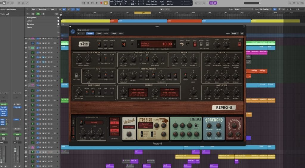 I love using Repro-5 for pads, leads, and chord hits. This synth has a natural, organic quality to it, which I think makes it work with this type of house music. It’s not overpowering or metallic. One trick to make it even more unpredictable and analogue sounding is playing with the “voice detune” knob. The onboard distorting unit can also really help sounds cut through the mix. The “corrode” setting can act as a sweet bit crusher, too.