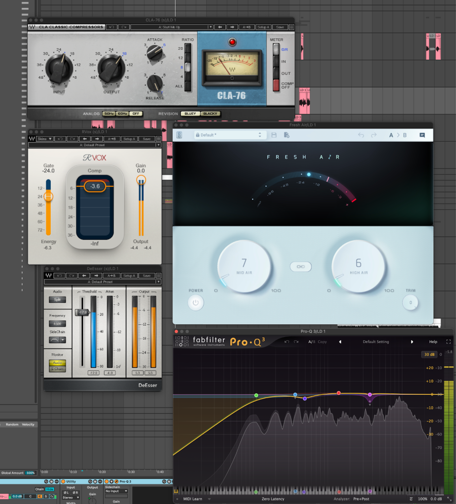 First, I’m using Pro Q to get rid of anything I don’t like about the sound. I’m recording on a Manley Ref C mic through a BAE 1073 pre amp and a CL1b compressor (both hardware) so the sound coming in is already great – I don’t need to do much to it. After that, I’m compressing the sound to give it that modern in your face feel. There’s a lot going on in the instrumental so I was pretty heavy-handed with the compression so the vocal still shines through all the production. Rvox is doing a bit of leveling here, and the CLA-76 is doing most of the heavy lifting to really squash the vocal. After that, de-esser is getting rid of any harsh esses poking through, and fresh air is giving the high end some sparkle, which really makes the vocal shine.