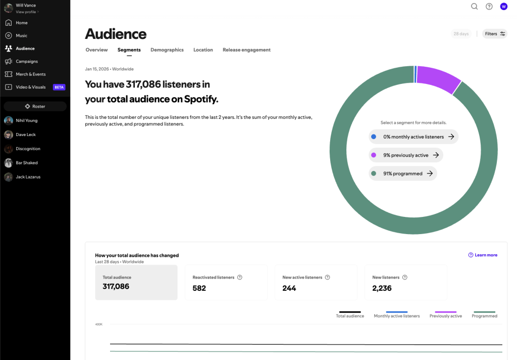 You can look at listener segments, then decide which group you want to influence next. If you see a large programmed audience and weaker repeat actions, you can focus on content that drives repeat listening, and you can plan follow-up releases that keep listeners connected to your profile. If you see a strong base of repeat listeners, you can focus on deeper engagement steps, like driving ticket clicks, selling merch, or growing your email list.