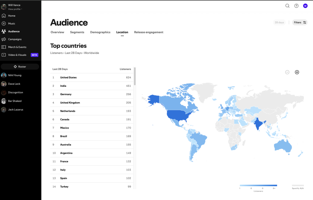 Spotify and similar platforms show aggregated demographics and top locations, and that data becomes useful once you connect it to action. If you see a city showing steady listener growth, you can run localized ads, reach out to local outlets, and connect with creators in that region. If you see a strong pocket of listeners in a market you did not expect, you can time posts to match that time zone and build small partnerships that fit that audience and eventually start positioning yourself to promoters in that market that you might be the right artist to get booked for one of their shows.