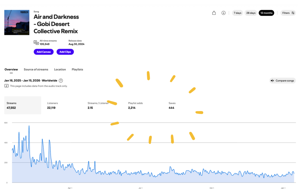 If listener-created playlists drive a meaningful share of your streams, you likely have community traction. In that case, outreach and relationship building can matter more than short-term ad spend. You can also use the playlist titles and curators as clues about where the track fits socially, then use those clues to guide your content framing.