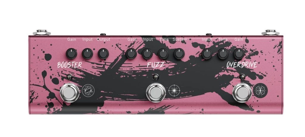 The OVERDRIVE section uses Input, Tone, and Gain. The FUZZ section adds Gate, Input, Tone, and Sustain, which gives players more control over how aggressive or controlled the circuit behaves. The BOOST section includes Gain, Input, and Output, along with two hidden DIP switches under the enclosure that allow further adjustment of boost frequencies and EQ behavior.