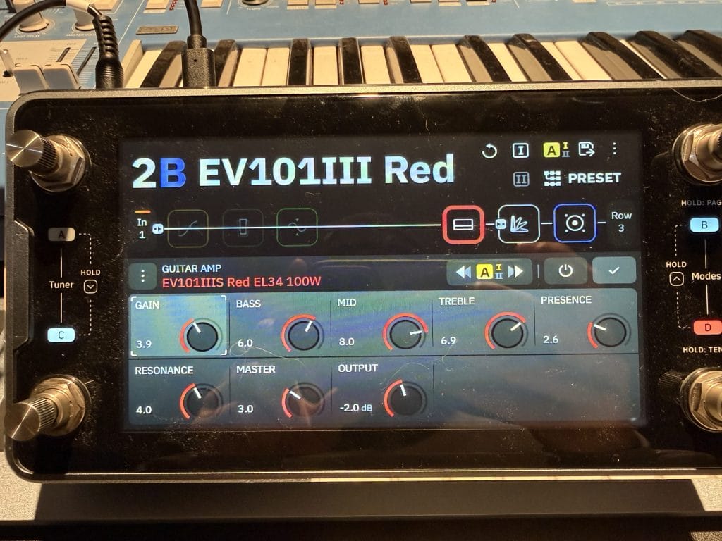 It actually feels like a DAW. Moving modules around is effortless with the large 7″ touchscreen. Each of the four stomp switches is also a rotary encoder, making navigation and editing a breeze. This is where things can get pretty crazy, though. You can switch between 4 presets per page, but per preset, you can utilize 8 different “scenes” or variations of that preset. You can also move between different banks by pressing multiple switches at once, giving you access to over 3000 presets.