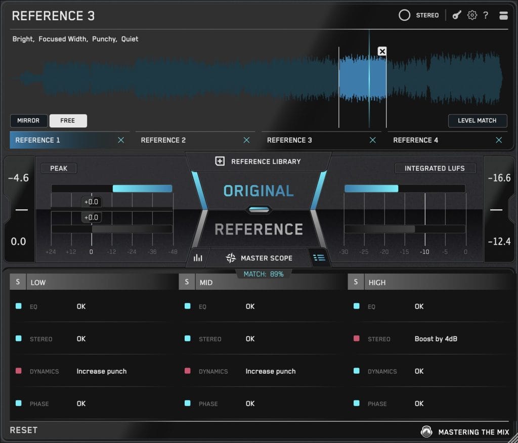REFERENCE 3 goes further by actually telling you what to do. The Mix Instructor provides written guidance based on what the plugin is analyzing, and it pairs that with tools like band solo so you can hear the exact problem area. Master Scope also adds a layer of precision by showing EQ and stereo adjustments needed to move closer to your reference.