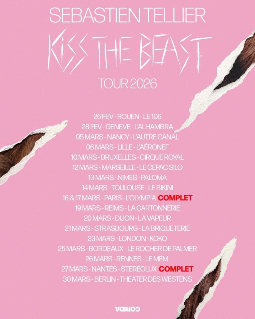 Tellier’s 2026 tour begins in February and spans France, Belgium, the UK, and Germany. Several dates in Paris and Nantes have already reached capacity, with other cities moving quickly. The live show will introduce material from Kiss The Beast alongside older work that helped build his reputation in electronic pop.