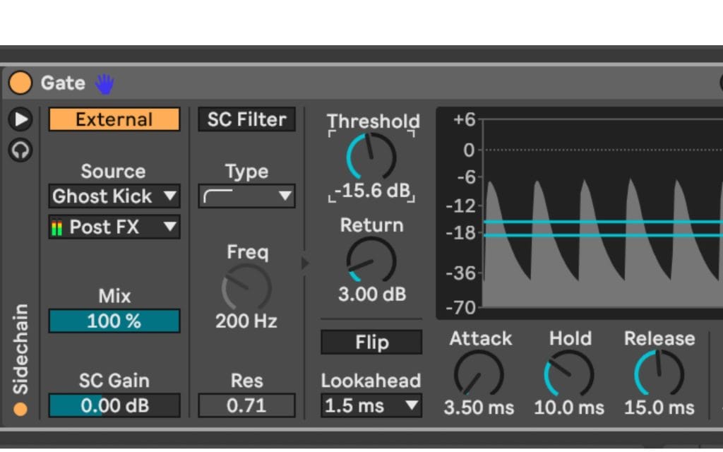 Then set the Threshold so the gate opens or closes in time with the kick, and adjust Attack, Hold, and Release to shape the rhythm. This approach can create a more obvious rhythmic chopping effect, and it can be useful on pads, textures, and longer elements where you want a more deliberate rhythmic pattern. It can also be easier to hear than compressor ducking when you are learning, because the level change tends to be more extreme.